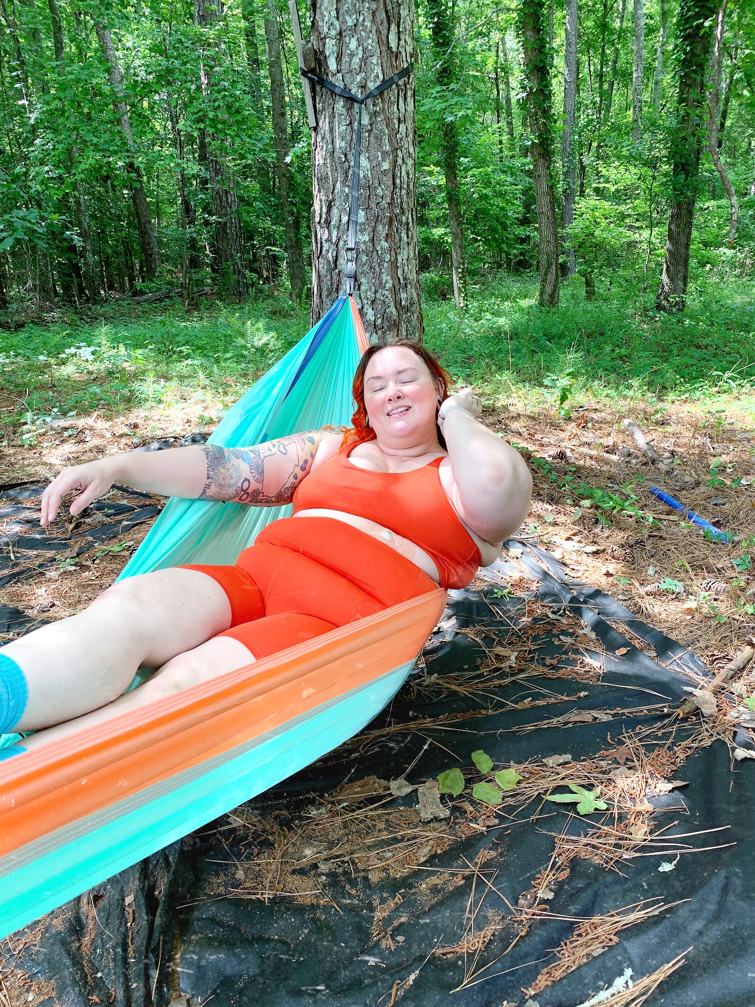 And I've really enjoyed the Nakie hammock so much. It's made of recycled plastic bottles (much like some of my other favorite brands). I love the sustainability of turning trash that's destroying our oceans and our planet into new, functional products. It's the only hammock made from 100% recycled materials and eliminates 37 plastic water bottles for each hammock produced. Plus, for every hammock purchased, four trees are planted at a reserve in Madagascar that support local villagers. As mentioned, I also really love that the weight limit is more inclusive than a lot of other hammocks I've looked at. It really just makes me feel safer as a fat person trying to enjoy the outdoors.