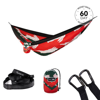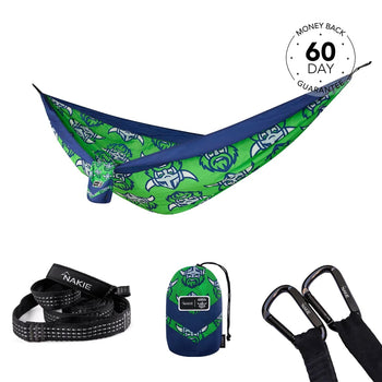 NRL Canberra Raiders x Nakie Double HammockDimensions: 3m × 1.8mWeight rating: 225kgWeight: 600g 2 × Hammock StrapsLength: 2.3m per strapWeight ...