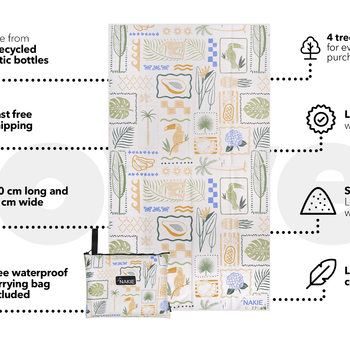 NRL Gold Coast Titans x Nakie 1 × Recycled Sand Free Beach Towel Dimensions: 160cm × 90cm Weight: 740 grams 1 × Water Proof Storage Bag Dimensi...
