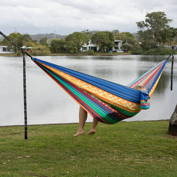 You absolutely can! Your hammock can easily be set up on your deck or balcony between some posts, or if you’re on the move, using your roof racks or bullbar. If all you have is a wall, we sell sturdy and reliable anchor points that make setting up your hammock indoors or on your porch super easy. Head to our instagram to see some cool set up ideas, including swinging on a sailboat!