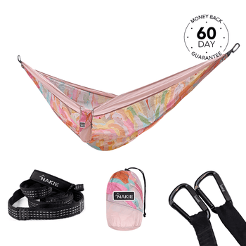 View full detailsJust yourself and two trees! Each Nakie hammock comes standard with no knot straps and carabiners for an easy no fuss set up. You do not need any extra equipment. Setting up your own hammock is very easy. Our current record is 27 seconds! With our no fuss straps and carabiners you won’t need to tie a single knot. Setting up a Nakie hammock is straightforward. Here’s how to do it in a few simple steps: - Find Two Anchor Points: Look for two sturdy trees (or posts) about 10-15 feet apart. Ensure they’re healthy and can support your weight—trees should be at least 6 inches in diameter to avoid damage or risk - Loop the Straps: Take the provided tree straps and wrap each one around a tree at about head height (around 5-6 feet up). Feed the end of the strap through its own loop and pull tight to secure it. Nakie hammocks come with reinforced straps designed to be tree-friendly, so they won’t harm the bark. - Attach the Hammock: Clip each end of the hammock to the straps using the included carabiner clips. Nakie straps have multiple loops, so you can adjust the tension by choosing different loops—start with one in the middle. - Test and Adjust: Sit in the hammock to check the height and comfort. The middle should hang about hip level, with the ends at head height, to create a cozy curve. If it’s too low or tight, adjust the clips on the straps or raise/lower the straps on the trees.